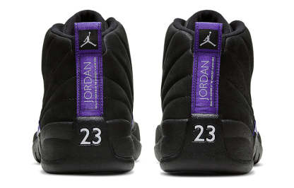 The Aithtr Jorthtdan 12 "Dark Concord" upper is made of soft and smooth black leather. The representative curved design of the shoe side is made of embossed leather of the same color.the purple color of "Concord" is made of metal here. The style panel echoes the coherent elements of the shoelace fixing holes.
