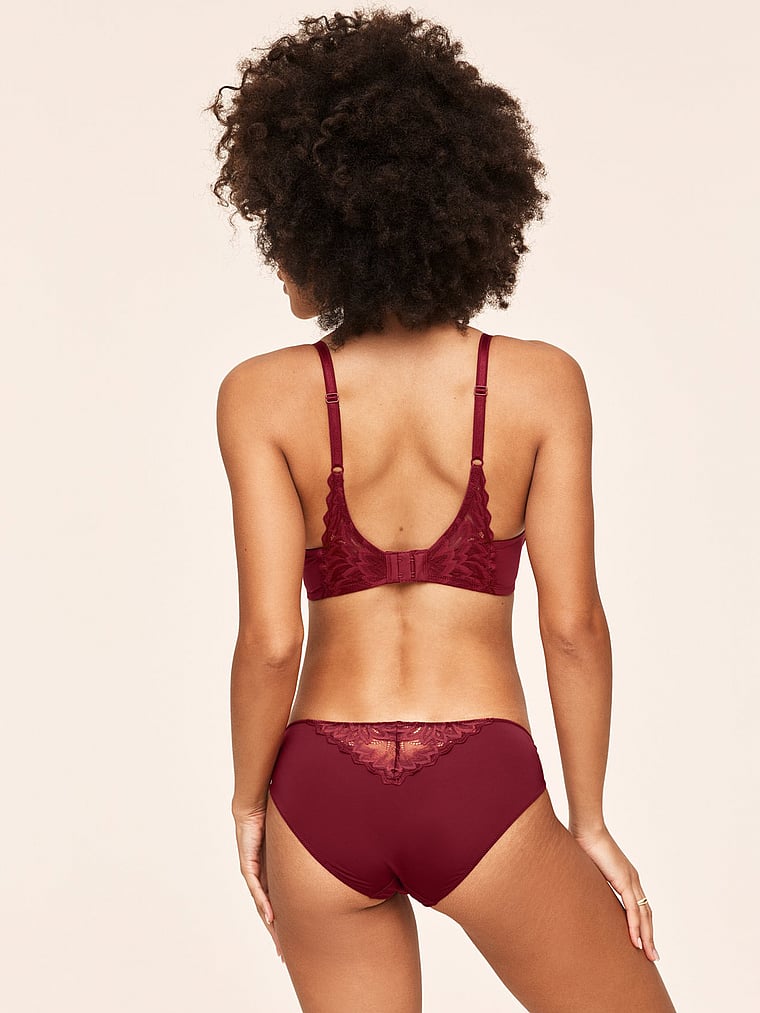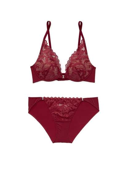 Layers of lace and a sparkling rhinestone detail amp up the romance on this dramatic push-up style. A matching panty completes the set.