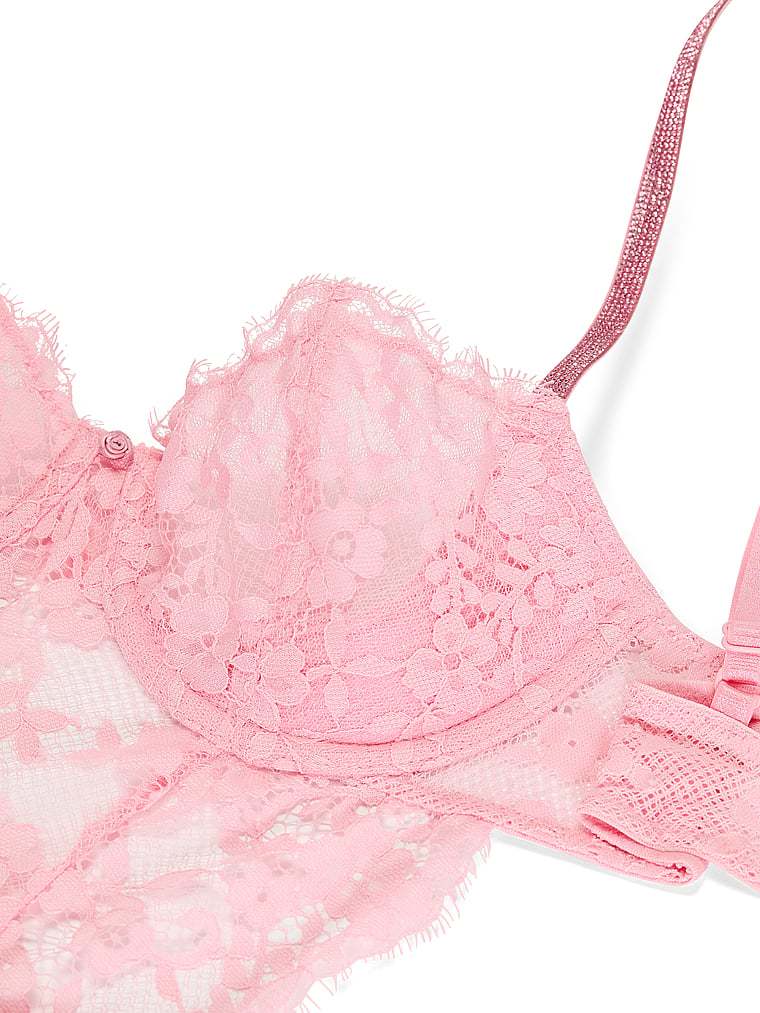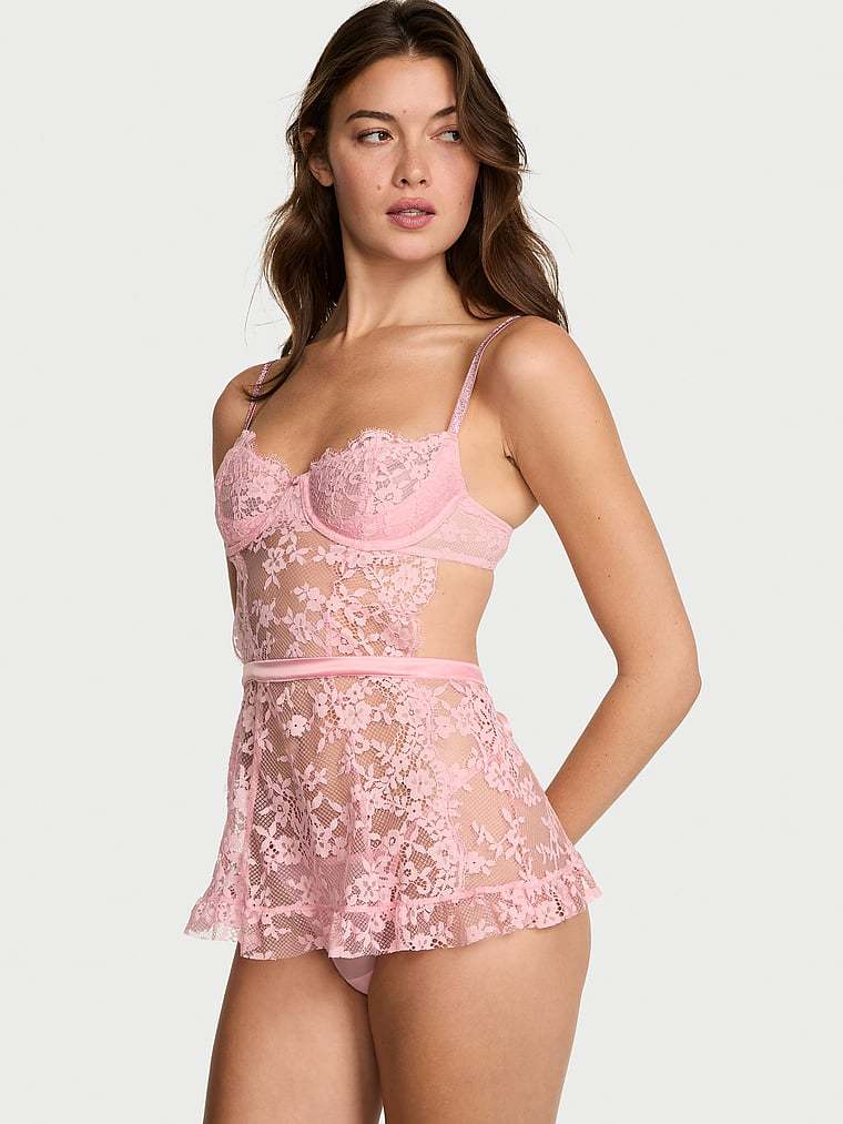 This flirty apron style turns up the heat with ultra-soft lace topped with our twinkling rhinestone straps. Secured with a satin sash in back and paired with the matching Thong Panty, it's sheer perfection.