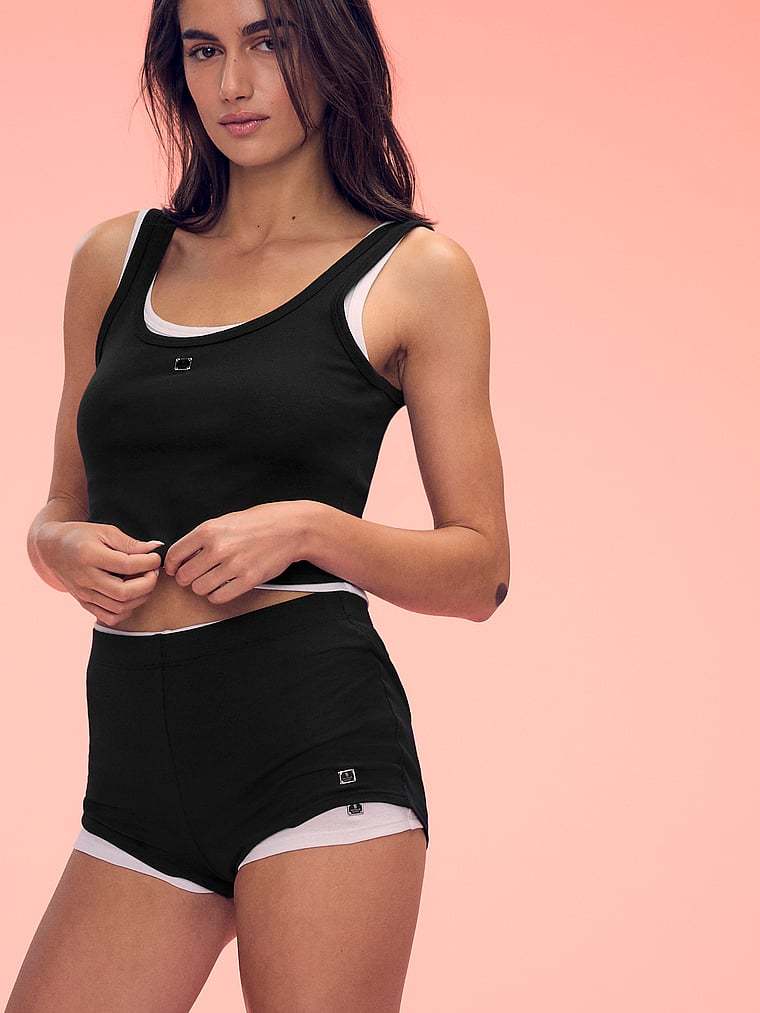 Our pure-cotton fabric is so soft and comfy, it's just the thing for lounging and sleeping. On top, a fitted Tank with our new logo plaque hardware front and center. On the bottom, curve-hugging Shorts with an easy elastic waist.