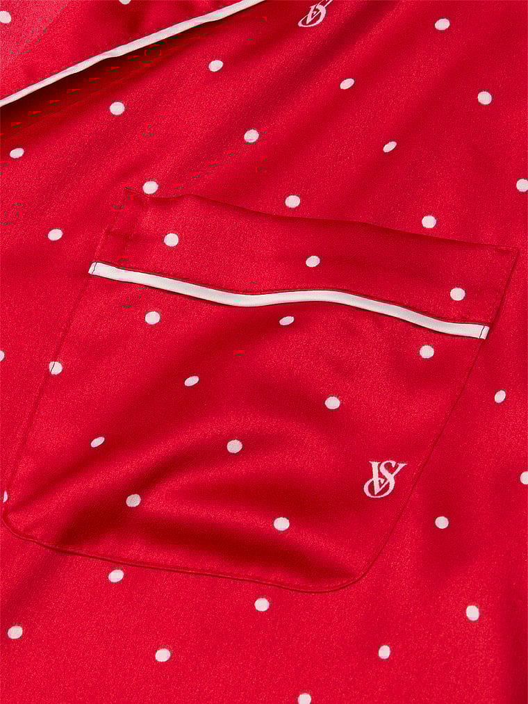 Wind down in this luxe satin pant and matching long-sleeve top with a chest pocket, notch collar, and decorative piping.